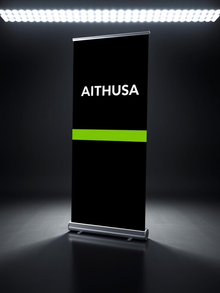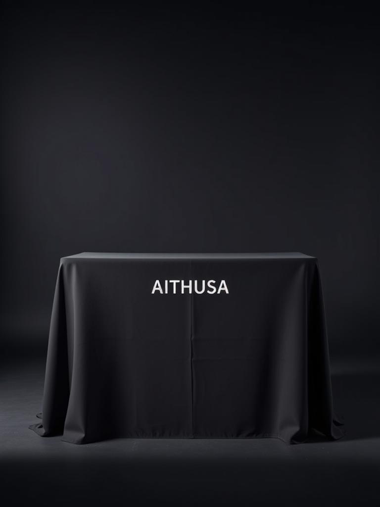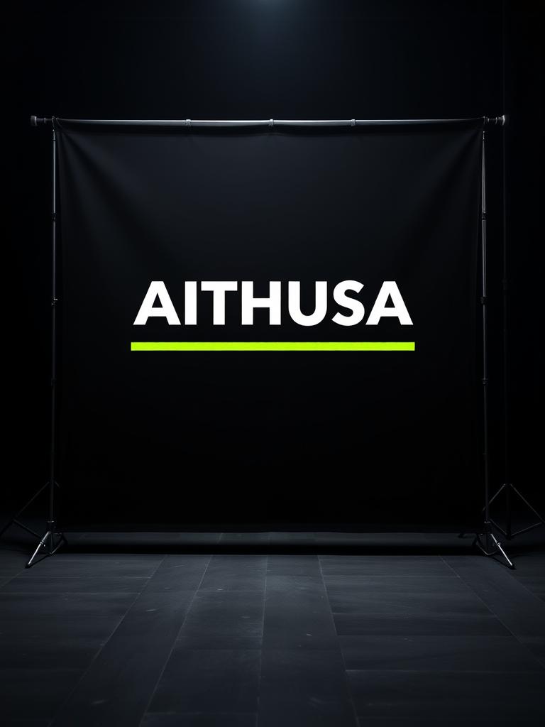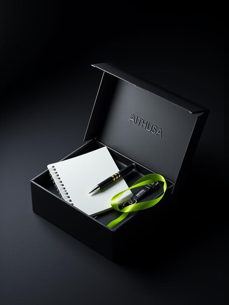 Sistema completo de presença física Aithusa em eventos: sinalização, identificação, welcome kit e palco. A marca ocupa espaço como comando visual, nunca como feira genérica de tecnologia.