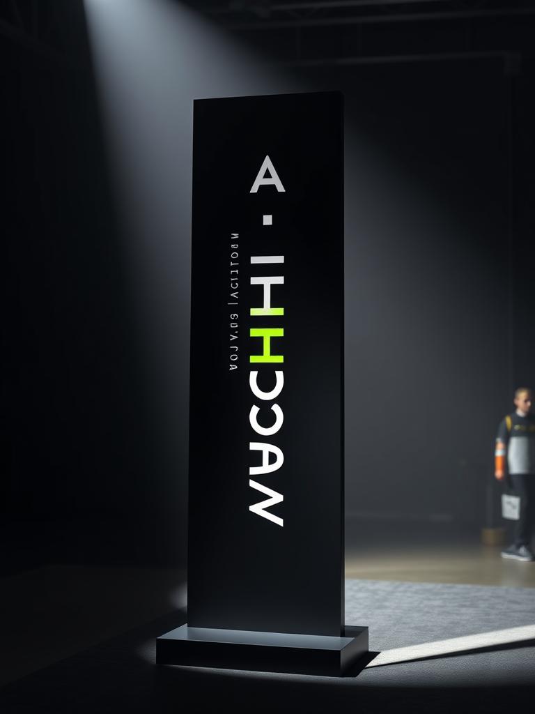 Cada peça física carrega peso editorial. Obsidian base + lime accent preciso. Nunca parece estande genérico de feira.
